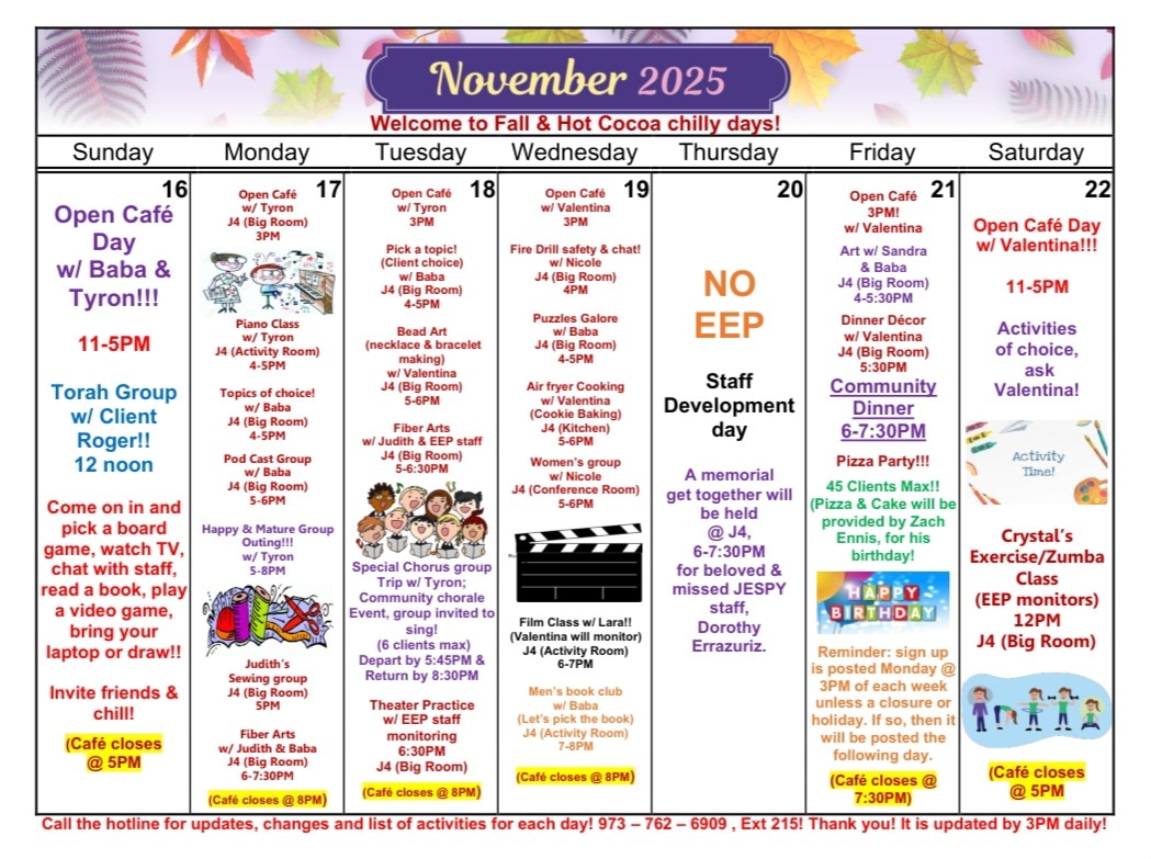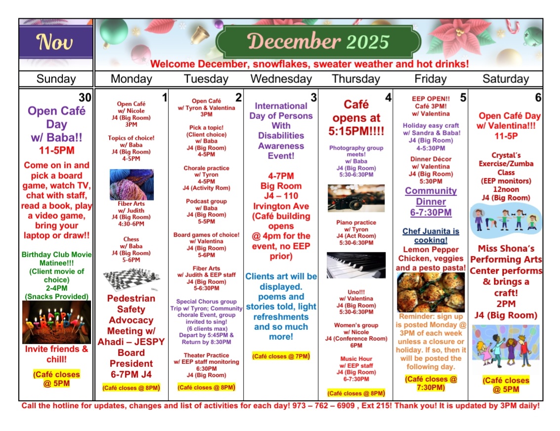 The JESPY Café is held in Judi House, a multi-purpose building that houses many of JESPY’s recreational, cultural arts and wellness activities. The Café, which is a meeting place where clients socialize, play games, or listen to music, is open on weekdays from 4:00pm to 8:00pm and on the weekend from 11:00am to 5:00pm.